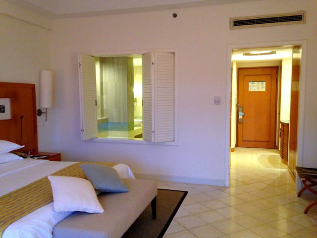 不知道是不是因为我们选的不是最贵的那种房型,进门后,虽然觉得条件也还可以,但是明显比瑞吉差了一个档次。不过卫生间那个白色的推拉百叶窗我真是超喜欢啊!很有感觉:)