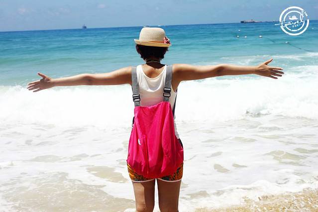 选完照片顺路又去百花谷逛了下,采购了些旅行纪念品和零食饮料,就打道回府了。一回到酒店,就迫不及待地换好比基尼去了沙滩。除了太阳镜和防晒霜,我俩什么都没带。