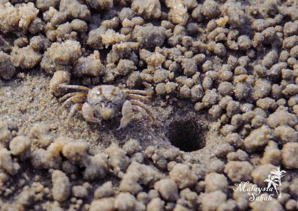 丹绒亚路的沙滩上好多小螃蟹和小螃蟹处理的巢穴