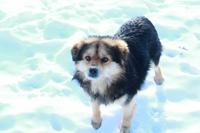 牧场里养的小狗,眼巴巴的看着我手里的面包。