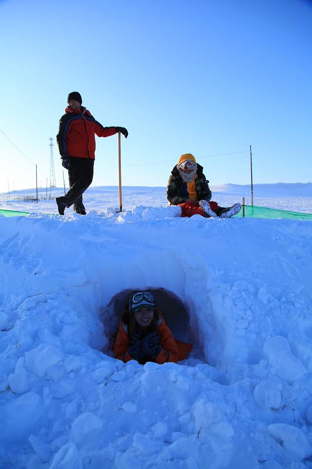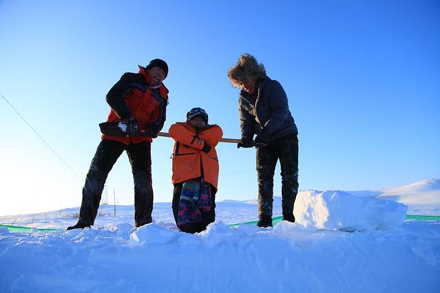 旁边的雪堆雪已经很厚了,司机大哥从车上拿出一个铲子来,给自己挖了一个洞把自己埋起来。。