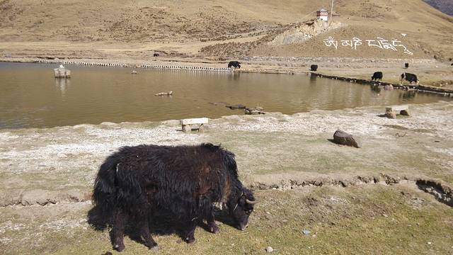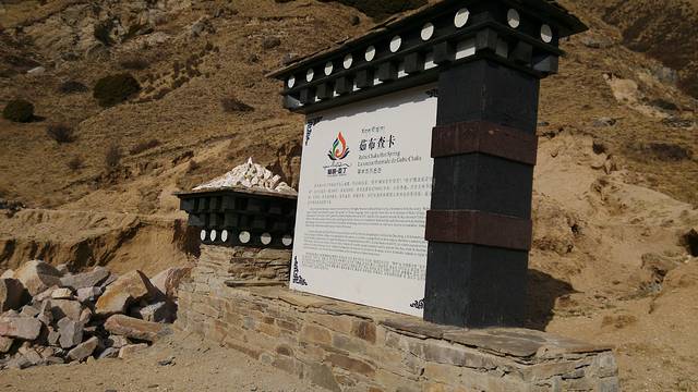 然后拐进一条岔路,经过一个小村子,开始走上公路,心里其实还是不停打鼓的,真的只有3公里吗?方向走对了吗?因为路上一辆车都没有,好荒凉。虽然天气很晴朗,阳光明媚的,就不停地安慰自己,走吧走吧,走了再说。路过一些美丽的黑牦牛,总喜欢走近一点听它们沙沙沙吃草的声音,就像黄龙的流水声一样,可以让人留连忘返。大概走了一个小时吧,看到茹布查卡村的标牌了,长长地舒了一口气。这种未知的不确定感总是那么地撩人那么地让人难以抗拒,而且只有一次,再来的时候就再也体会不到了。对于陌生的目的地好奇,想要去探索,但路上可能会动摇,然后不停说服自己,然后可能还会动摇,就这样摇摇摆摆迷迷糊糊地可能到了终点,顿时觉得之前做的一切都是有意义的,这样的经历太美好了。
