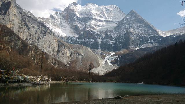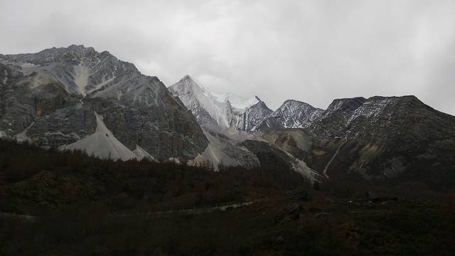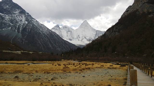 一路走进去风景都是极好的,时不时路边有一头牦牛看着你虎视耽耽地吓我一跳,还可以看到还未融化的冰柱和半山腰的一些冰川。中饭带了一些零食全当打发了,想着晚上回去要大吃一顿:方便面加料一根火腿肠!快接近洛绒牛场的地方就可以很清晰地看到央迈勇了,亚丁的主体就是三座神山,左线可以看到央迈勇和夏诺多吉。央迈勇是“文殊菩萨”的意思,海拔5958,洛克说央迈勇是他见过最美丽的雪山。不过央迈勇的形状确实很特别,就是我这种完全没有任何绘画天赋的人笔下可以画出的山的样子,三角形雪山。