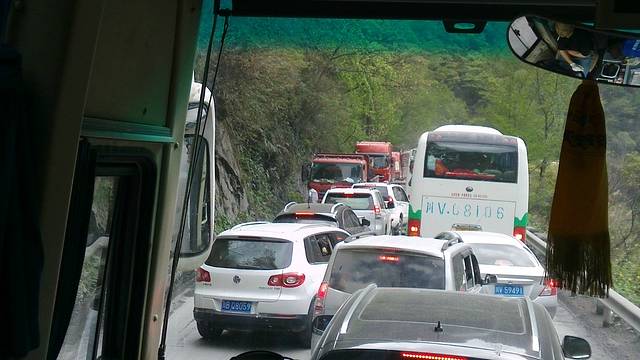 堵得久了开始有车要加塞,本来就只有单向两车道的车,还有小车要逆向行驶想要冲到前面去,他们也知道上去的结果肯定是把路全部堵死,对面来车了怎么办,可能同方向的车会看到他们没办法只能让他们默默地加塞了吧,所以对于他们来说还是划算的尝试。本来大家都好好地排着队,有人做出这样的举动然后占得了便宜,于是乖乖排队的人们心里不平衡了,也开始效仿,社会秩序就是这样被打乱的。正当我脑子里思绪万千想来想去的时候,看到刚才加塞上去的车默默地又倒回来了哈哈哈,可能是这边的车堵得实在是太厉害了,完全动弹不得,无机可乘。