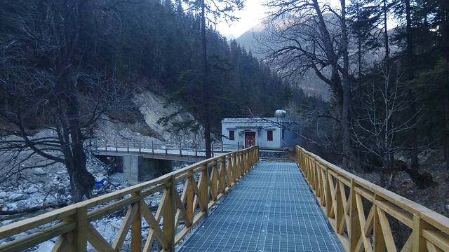 回到大巴点差不多六点,荒无人烟的样子,难道没有车啦???管理处好像有人在做饭,敲开门是一对藏族夫妻,他们极其和善地告诉我应该是没有班车了,我说那门票上写的到六点半哪,他们说你可以试着等等上面下来的电瓶车,还问我要不要喝开水坐下来休息休息。我谢谢了他们的好意决定还是继续往外走一段吧,路上如果有车再搭。从班车点走出去还有一段大概2公里的栈道,早上坐车进来的时候还在想可能没有机会走。同样也是幽静空旷,虽然景色一般也走得很累,但还是告诉自己,一切都是最好的安排,现在我真的可以说我把亚丁所有的栈道完完全全都走了个遍。