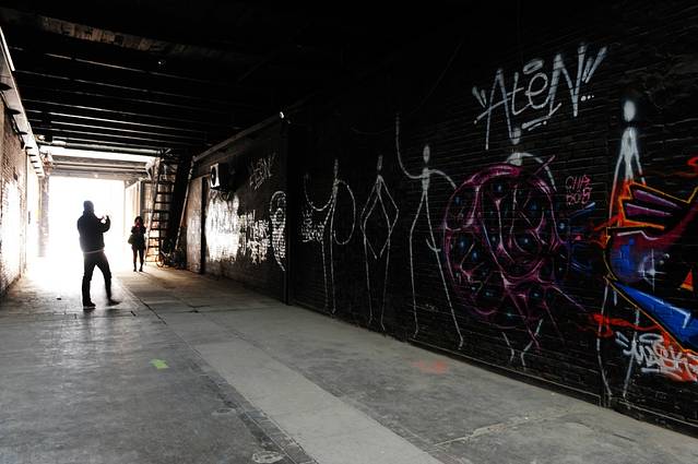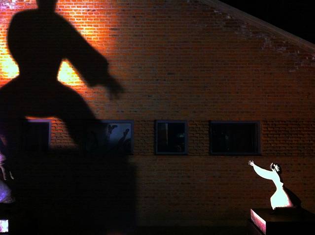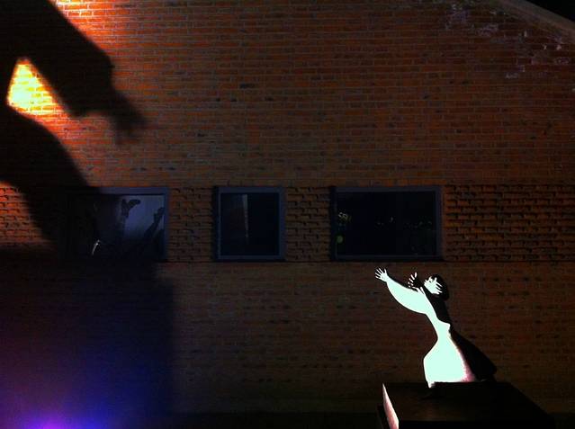 全鸭季对面是一间坡屋顶的小屋,前面放着雕塑。但灯光拉近了他俩之间的距离,仿佛活了起来。之间的语汇和互动,影子和实体之间的交流。有意思的是,你看到的实体和实体之间却完全没有关系,只是因为一束光。我想白日,这个庭院不会那么有趣,有时候,只是一个时间点,因为那个时间点,才会欢喜上某物某处。后面的窗口里是一些pop的图片,倒栽葱的时尚女郎伸直的腿,倒也和这氛围分外和谐。各个年代的拼贴和呼应,甚好,除了不小心被删除的相机里关于此处的照片们,只能用手机里的充数了。