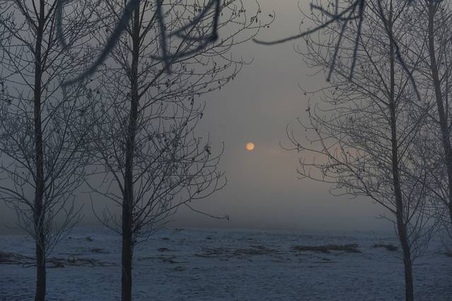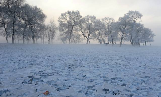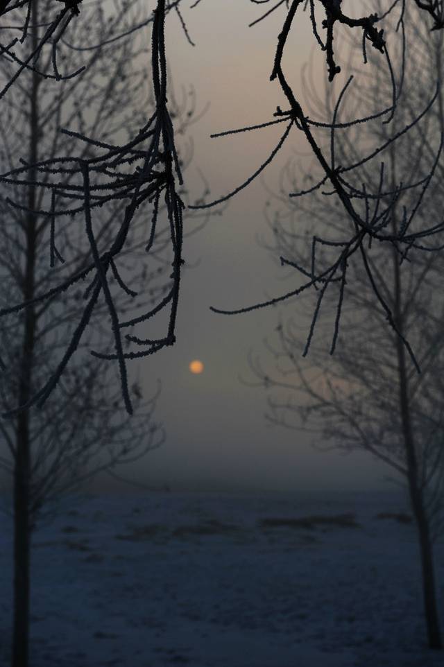 当天的12点,说好的出发,丰田的14座,7+3+2+1,车非常好,每人200.一路昏睡,车里哈出的热气在玻璃窗上凝固成藤蔓花,用体温抹开,又结冰,抹开又结冰。在开往雾凇岛的途中,看到了落日,发着无力橙色暖光的太阳,又大又圆。有一次路一转,大大的太阳就悬在路的尽头,仿似公路片一般。我如痴地想记住那一刻,而身边的人都在沉睡。