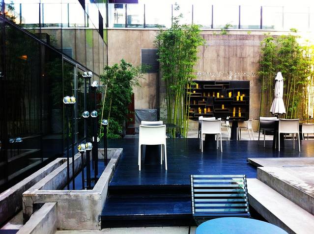 其实,三里屯最大的惊世之作还是隈研吾的theoppsitehouse,瑜舍。曾经想要去住,但因为它2400块的房价而止步。三面围合的客房含着一个中庭,北方的阳光永远是主题,阳光盒子,终于知道了以前LD一直喜欢的四季大厅是什么样子,就是那样能把阳光盛满的空间。腊月,和小七还顺着别人的房卡上到了客房层,一间开着的客房内部是如此的简约,以致没有任何卖点,也许这就是冲击,惊世骇俗的公共空间和可以安心催眠的客房,于是便了了图想要住一下瑜舍的欲望。地下的餐厅sureno应该是西餐厅,中午配好的餐是158,加一杯酒198,在可以承受的范围之内,那个转角的玻璃窗,对着一个长桌,玻璃窗前是一汪平平缓缓外溢的水,那种安逸和优雅,简直要击翻图的心灵。