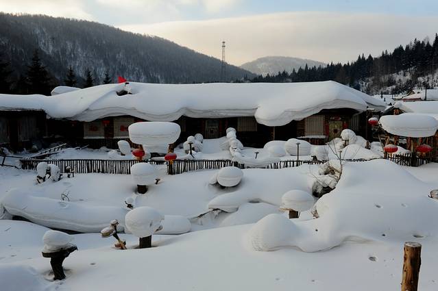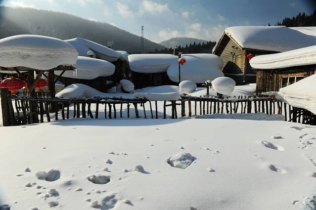 远处的山和云呈现两道offset有点童话里的感觉,又要说到兔子,兔子先生拿着怀表对图说,来不及了,真的来不及了。老板娘在过来的路途上对我说,雪乡的大雪还没有下呢,一般要到三月份,三月份大雪一下,才是真实的雪乡。所以现在这个季节这些雪蘑菇和屋檐还不是那么饱满,仔细看看,都像雪泡芙,是一层层的薄雪堆积起来,所以没有那么蓬松。但如果眼光不那么挑剔的话,能见到这样还是农庄感觉的小房子,应该觉得幸福和满足。