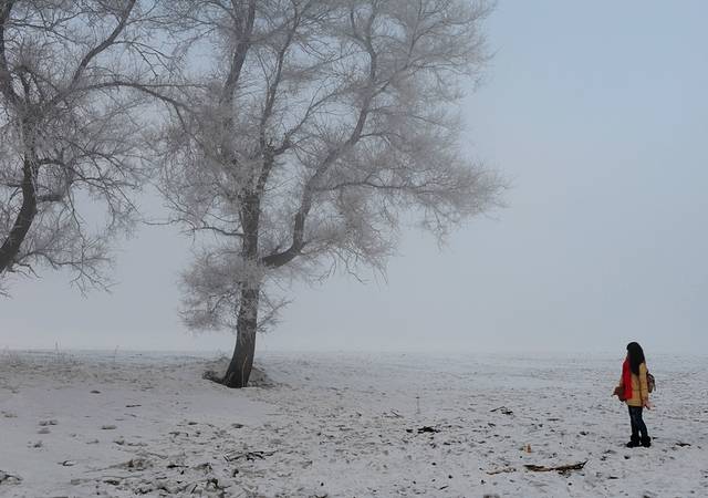 店家的妹妹说,昨天的雾凇凝结地特别好,晚上十点就凝上了。晚上10点多,我们奔到渡口边张望了一下,那些黑压压的树枝,什么也没有发生。