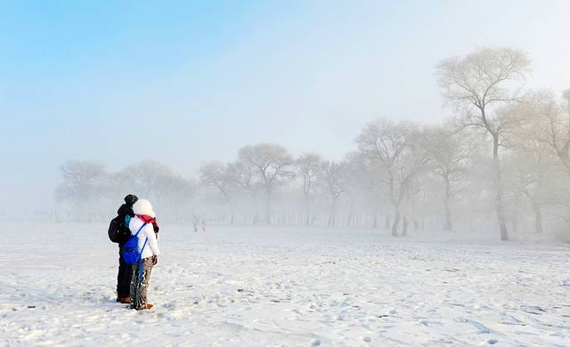 一起看的日出,因为雾太大,太阳无力的从远方升起,和近处枝头上挂着稀疏的雾凇。