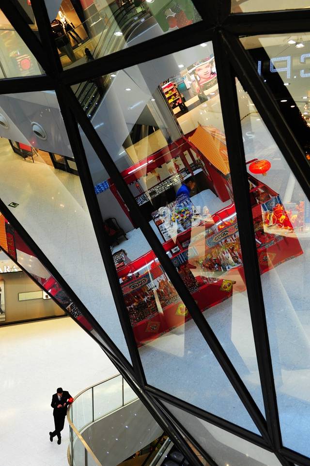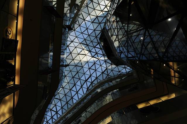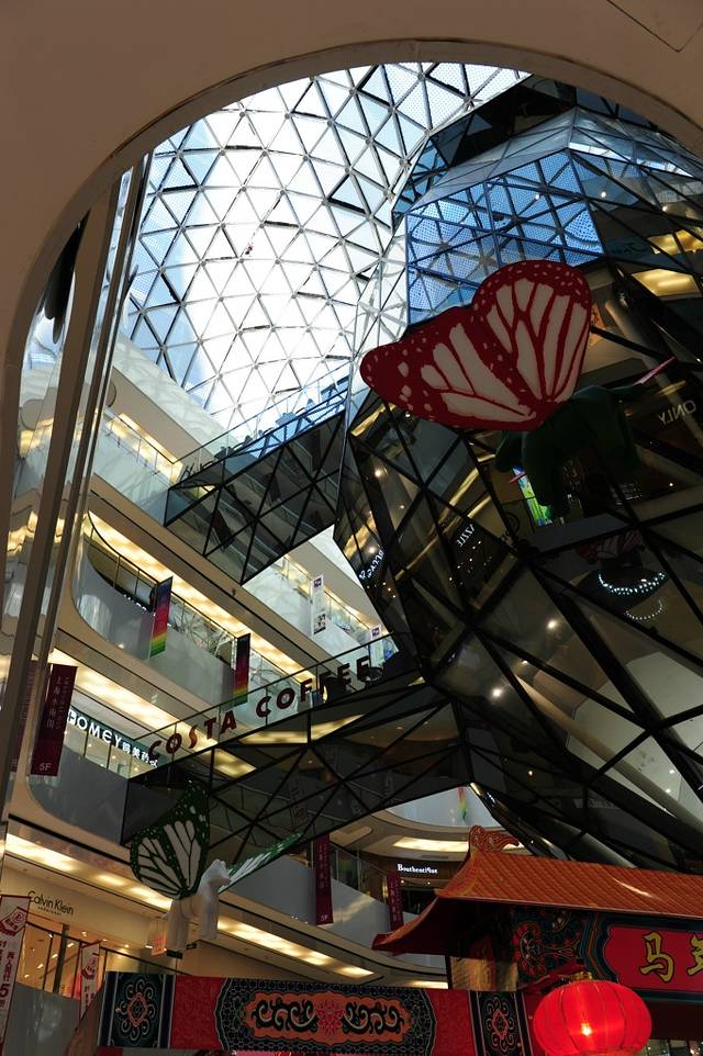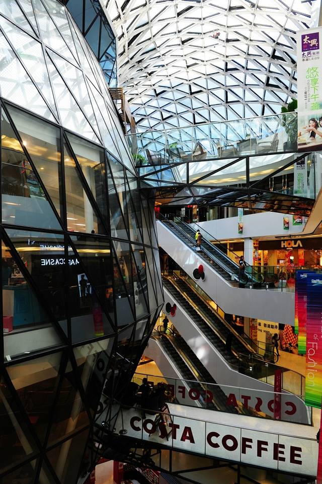 这就是我挑选的正常的地方之一,卖点就是它是我的一只友做的,北京来福士。是个小小的几万平米的商场,手法无比的简单,就是在一个巨大的中庭里面做了一个巨大的扭动的上大下小的玻璃泡,玻璃泡里又有一些可以使用的空间,屋顶也是弧面的玻璃,它的材质选的特别的奇妙,可以说反射和透射比选的特别的好吧,让你的世界充满了幻影。你看别人的时候,又能看到自己。任何有趣的建筑都是成功的,其他都不说,例如地下一层在炸薯条,最上层的咖啡厅也能闻到的油味儿。