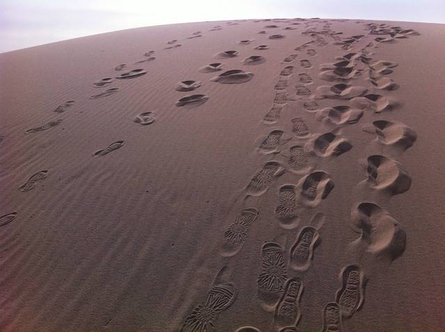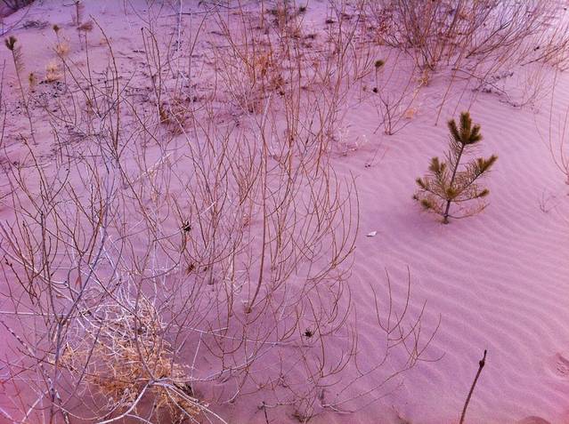 远处有个白色的沙丘,沙子特别的白,有些地方沙子被冻住了,就踩上去实实的,有些地方没有冻,就深一脚浅一脚的。我想起来那时在鸣沙山,为了逃票翻越的后山,当时踩着一个娃的小臂才爬上的铁门,差点没把娃踩骨折了:)。站在沙丘上,看着远方更多的沙丘,总是觉得远方的那个更大更高更洁白,但当百转千回的费劲气力地到达那里,回头看看其实也和脚下踩着的差不太多。中午的太阳有点好,也没有更冷。