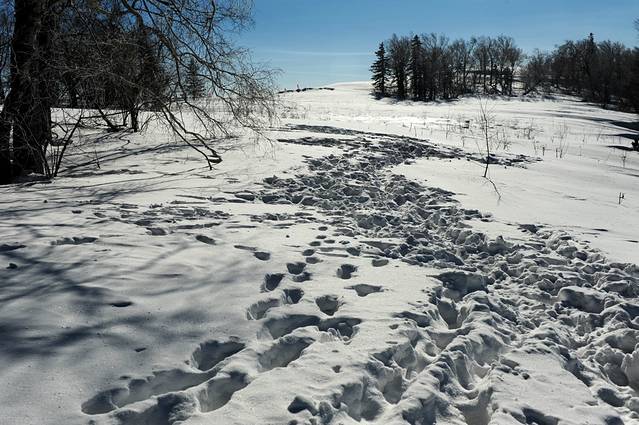 突然就有人看到建筑物了,说前面有围墙,好高兴啊。就像一堆的吐槽终于找到了安放点,就像你发了一条weixin就睡觉了,第二天一觉醒来发现右上角的圈里写着10。这就是羊草山顶,也是一个重大的看日出的地方。远处有奔跑的雪地摩托。没有脚印的地方,雪几乎有80cm,当我试图走到雪的深处去拍一株植物,后来真的是因为雪太厚而无法到达。一片空旷的冰原,配上萧瑟的树枝。此生都没有见过的景致。在半路,图的冰爪就不见了,以至于一步一滑的,然后队列就成了下图这样,图成为了一节无动力的火车车厢,亦步亦趋。再凑一只沙和尚,就完满了。
