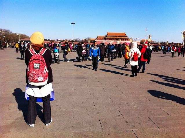 从前门的地铁站一出来就知道什么叫做首都北京了,到处是人头和旅行团,到处都是栅栏啊。只能说,你能看到你想去的地方,但是就是走不到啊。沿着栅栏一直走,走了好远,才找到一个出口。看到一个铛铛车,好像就到了前门天街。前门天街看的我都不想掏相机,手机也不想掏。是一个南京东路般的步行街,宽宽的步行街,两边是仿古建筑,买一些垃圾食物和义乌批发来的千篇一律的旅游纪念品。臭豆腐的味道弥漫在空气里,心想臭豆腐和北京有半毛钱关系。
