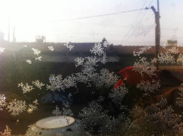 早上定了闹表醒来,我知道已经晚点了,车厢里黑黑的,车厢的接头处已经结冰了,我把我满是静电的小辫子梳了一下。5:00。外面也是漆黑,也看不出有没有下雪。虽然其实我期待中就是一下车就是满地雪。