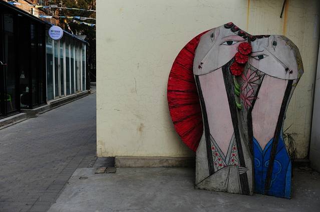 还没有到三里屯的路上就想到上次想去了很久而没有去到的1949 the hidden city。其实具体位置在团结湖地铁站往三里屯走,走到快到三里屯路口的对面。其实是一堆餐饮和酒吧会所,加上一个小小的展厅,内庭院里有一些雕塑,我喜欢它的小小,和它光感的应用。我喜欢它看上去高档而作为这样的一只乱哄哄的我,在北京这样的地方没有被驱逐。去之前,我就想,其实大可堂皇地去里面全鸭季吃一顿,那个餐厅把吃烤鸭打扮的高尚优雅,而当我已经站在那个小庭院里面,庶民的心就在说,吃什么吃呀,走走就好了,全鸭季完全可以留到下次再吃。我的心里总有两个小人在打架,一个故作优雅文艺的小人和一个杂乱无章能一屁股坐在地下拍拍裤腿说你能拿我怎么着吧的小屌丝。它们的输赢我也一直都没有把握。上面的图是一个会所,通往会所的小桥两边都是高高的拴马桩,拴马桩的顶部不是可爱的小狮子之类,却是一颗颗人头。小桥两侧都植着松柏,在这清冷的夜里更逼出一阵寒意。