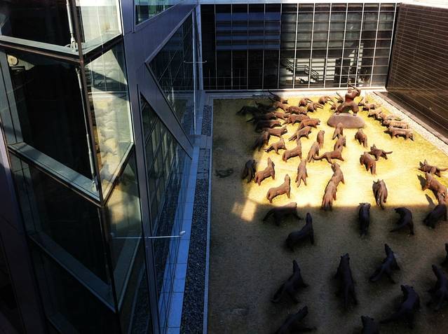 当日我看到庭院里的雕塑总觉得在哪儿见过,回来翻看手机就想起来了,想必是peking相当有名的艺术家。在侨福芳草地,它是一个有意思的商场,当时的卖点是商场里全是达利的真迹,以为就是个类似K11文艺气息浓重却小巧,卖弄一下小清新的地方。当图和小七从一些乱哄哄的小巷子看到它的时候都以为它是个展览馆或者体育馆。金字塔般的外型,大片的玻璃幕墙,当我们从一个背阳面通过巨大的中庭的一转弯,一大束探照灯般的阳光洒下来,真是WOW point!钻石型的塔式结构吊起从中间飞越的连桥,空间无用而霸气,有人说空间大把的用来浪费才是好建筑。的确,时间大把的用来流淌才是好人生。