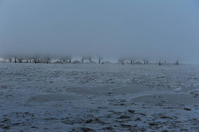 一大早外面就雾气浓重,听说雾气要在最冷的时候到这里,雾气就会凝结在树枝上变成雾凇。但今天,雾好像迟到了。我们到达韩屯渡口的时候,完全看不到对岸。60块的费用,5分钟就到了,后来回来的时候,看了一下摆渡距离:200m。