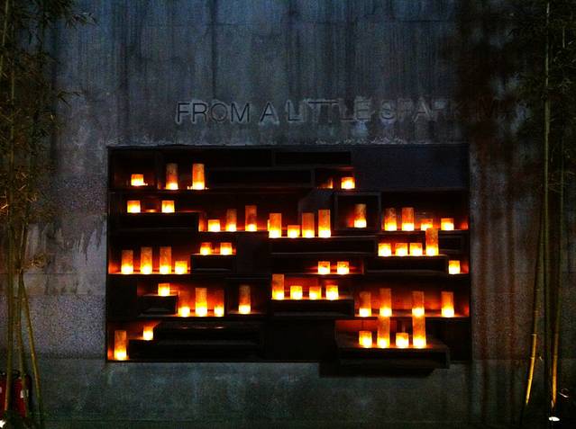 餐厅外有一个下沉庭院,正好是酒店和商场的分界线。那晚,里面点着明灭的烛光。我不知道为什么通感到尼泊尔的帕斯帕蒂斯庙,那是印度教的烧尸庙,人在平台上被火葬,灰烬被推到河里,毫无尊严,却是他们最高的仪式。当时我站在离烧尸台不到2m的平台上,被燃烧的烟气和粉末浸淫。我体会到生死的相隔,悲伤和往昔。和之间的那个断点。