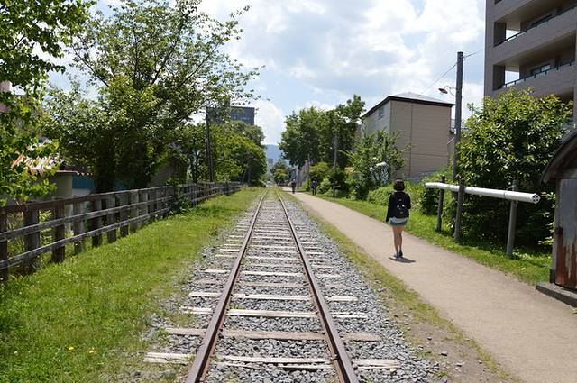 我们沿着小樽站对面的街道笔直向前走,直到看到北海道最古老的的铁路“手宫线”,虽已废弃,但穿过市区且保留完整的铁轨仍不失为小樽独特的景致。