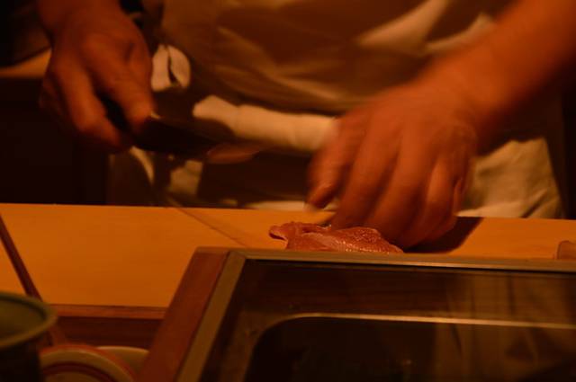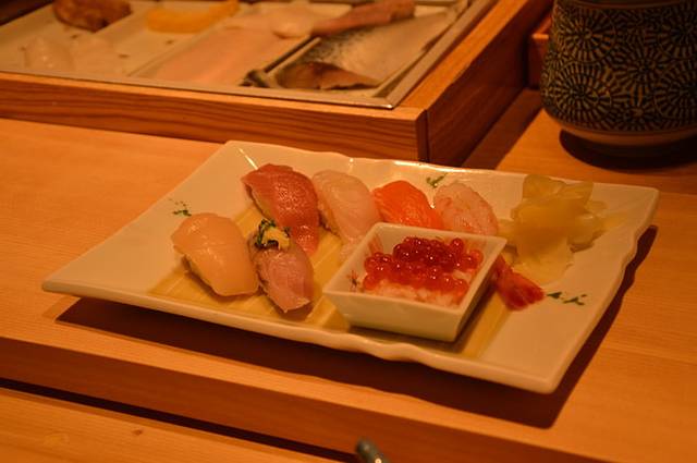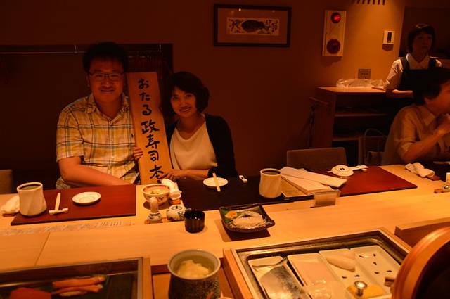 门口有个老太太接待员,因我们没有预约于是在她的本子上写下名字到一边的接待室等着。接待室还有几个人,大家坐着,翻菜单,鸦雀无声,不时有人低语交谈两句。穿短裤背双肩包的我在这种环境下总觉得坐立难安的,好在坐了不多久就有人来叫。大概名字读起来比较奇怪吧,服务员非常细心地问我们说日语可不可以,并引导我们进了一间有流理台的房间坐定。这时候紧张的心情终于稍稍放送了一点,我点了一份政寿司的套餐,LG点了一份日式牛扒。