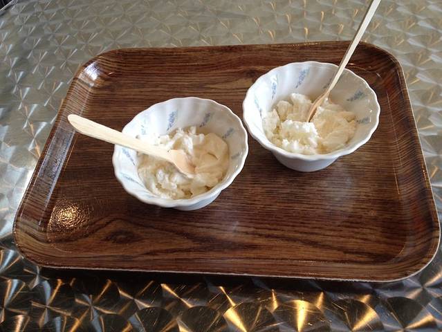 去漂流之前有段空挡,就去体验了一下自制冰激凌。那个时间段居然只有我们两个人,气氛略显尴尬,接待的小哥笑着说:11点有个台湾团30多人来。立刻就觉得只有两个人也不错了。制作过程很简单,就是奶加奶油加砂糖,放在铁罐子里密封,外面裹上冰块,用力摇十五分钟。小哥还弄了秒表,一分不差地摇,罐子好重……果然自制的冰激凌格外香甜,想是因为糖放得比较多吧。