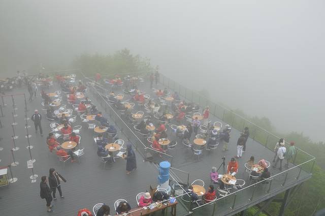 我们全副武装地在云海咖啡厅里坐了一会儿,全然没有那种浪漫的气氛,好歹也要了两杯咖啡来喝,四处转转拍照。正要灰心的时候来了个STAFF告诉大家今天还有希望,再等等雾散开大概就能看到云海,于是我们又耐着性子等啊等啊,最终还是不得不承认与云海无缘。好在缆车上的景色也令人心旷神怡,只好以此聊以自慰。