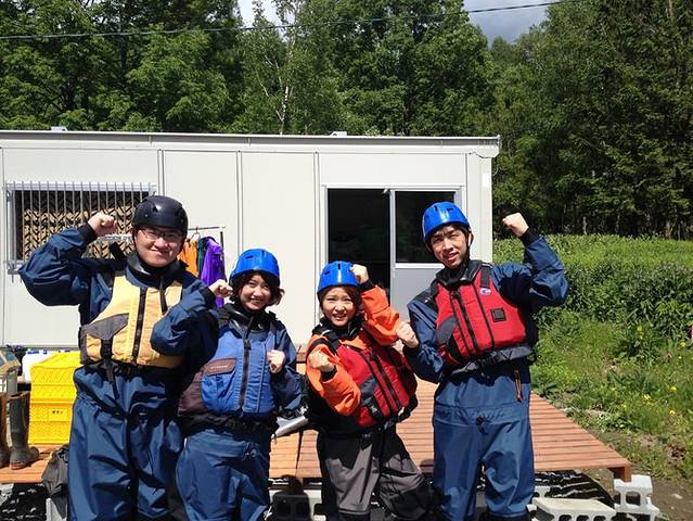 下午是今天的重头戏漂流,到楼下集合交了钱和另外一对从札幌来的男女一起坐车去了漂流地点。路上STAFF还介绍了一下:这次漂流的河叫空知川,认知天空的那个意思,是日本第一清澈的河。车子开了许久,札幌的那个女孩子格外的兴奋,我倒是心里在打鼓,担心漂完后湿成落汤鸡没有换的衣服。之前问STAFF时明确说只需要毛巾,因为除了脸、手和脚外哪里都不会湿,我一直是将信将疑的,因为在红河谷和长白山漂的时候都只有一件雨衣遮挡,结果可想而知。