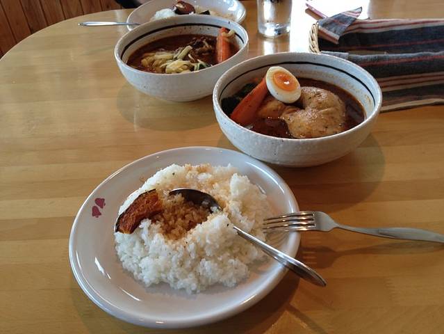 告别札幌来的两位同伴,肚子适时的饿了起来。和去森林餐厅一样的通道另一边有一条名店街,一家一家小店卖着北海道特有的小吃,居酒屋也有汤咖喱也有札幌拉面也有高级意大利菜也有,最后我们选了汤咖喱,名叫らっきょ。度假村里的餐食比其他地方要贵一些,不过分量倒是也很足,吃得很饱。
