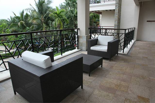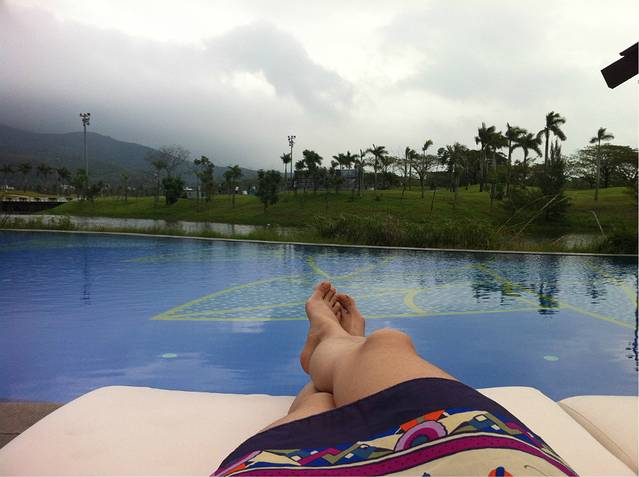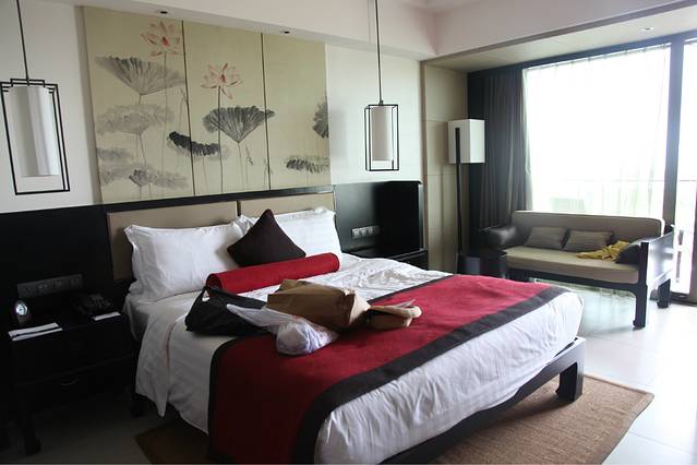 我们入住的高级大床房。房间很大,洗漱区也带着一个大大的泡泡浴缸,房间自带一个大大的阳台,而且因为我们的房间正对着高尔夫球场,所以视野和风景很不错,一眼望不到边的鲜绿草坪,快到伸展到阳台的怒放的杜鹃花,正是这样美好的东西,把阳台妆点的更加舒服和美好。
