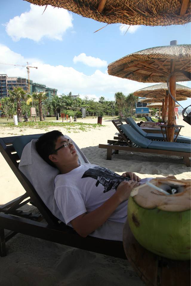 4、躺在沙滩椅上一定要先铺一层毛巾,不然你会沾一身沙子。