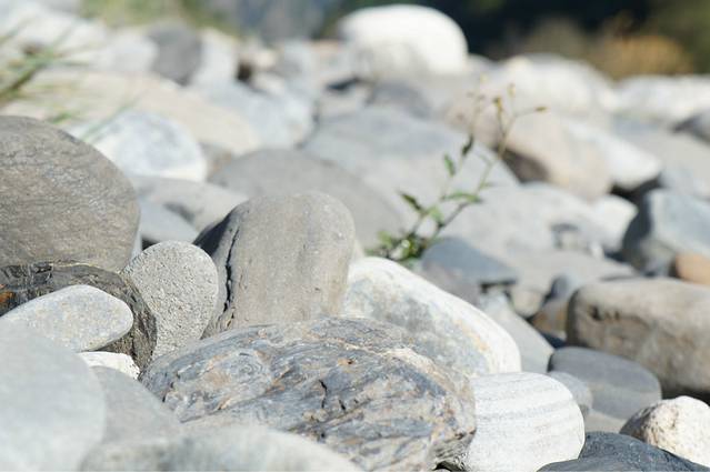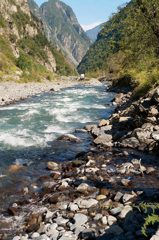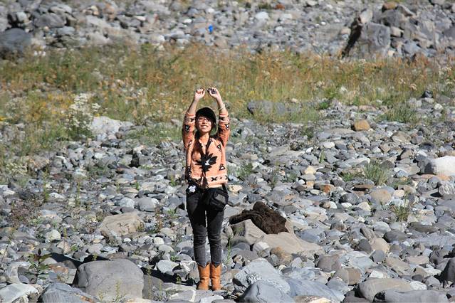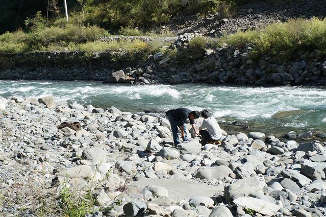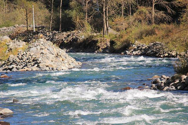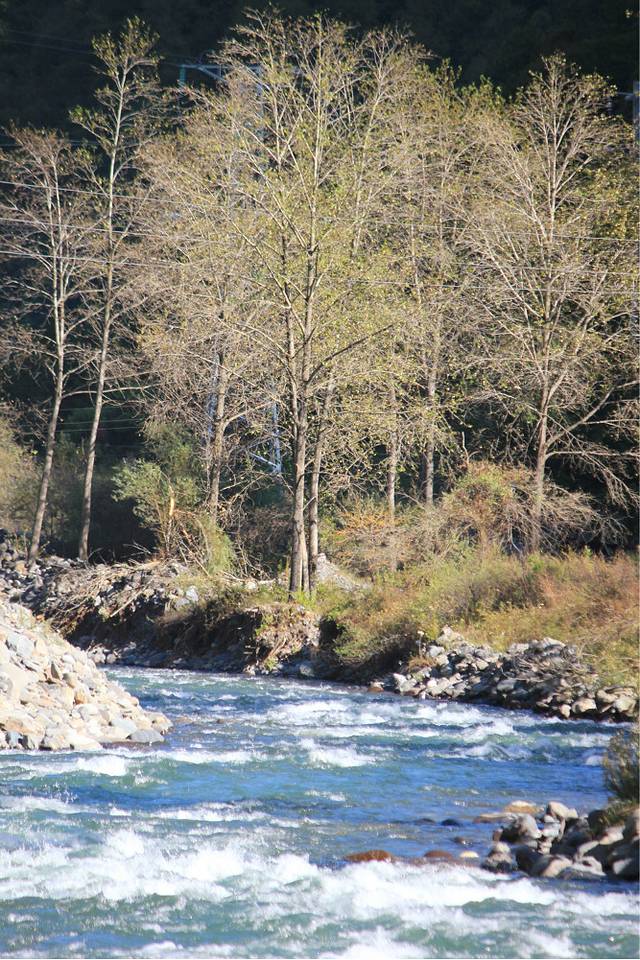 吃完饭继续上路,由于计划有变,我们决定下午就去毕棚沟里玩,趁着天气大好。怕明天天气有变,之前看天气预报说明天会有阵雨。在去毕棚沟的路上,我们被一个石滩吸引,满地的白石头,水流非常湍急。爸爸是个石头控,于是我们下车去石滩上了。