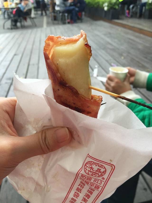 这是埔里当地的小吃,陈先生特意买来请我们吃的,里面是笋外面有培根包着,吃起来,口感还不错。