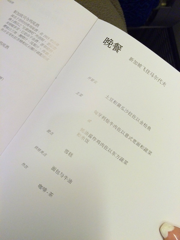 先来说我们遇到的小插曲,行程原定航班是美佳航空直飞马累,临出发前一晚,客服通知我们美佳航空因故障,临时取消,帮我们改订新加坡航空,时间提早6个小时。就这样,我用10分钟快速整理好没收拾好的行李,急急忙忙的赶到了T3。在机场,我们遇到了跟我们完全同行的另外一对小夫妻,一起玩的很开心。就这样,我们一起踏上了旅程~这里还要赞下新加坡航,服务超好!餐也很好^^不愧全球前十航空!