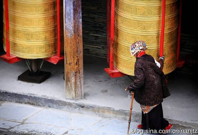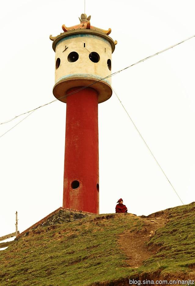 村中心的山包上竖立了一枚巨大的转经筒,常有信徒去充当经筒上的小坠子绕着大经筒不停的转,以快速地积累功德。