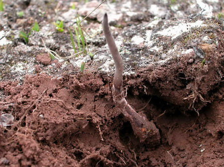 虫草生长,出自寄主幼虫的头部,单生,细长如棒球棍状。