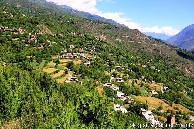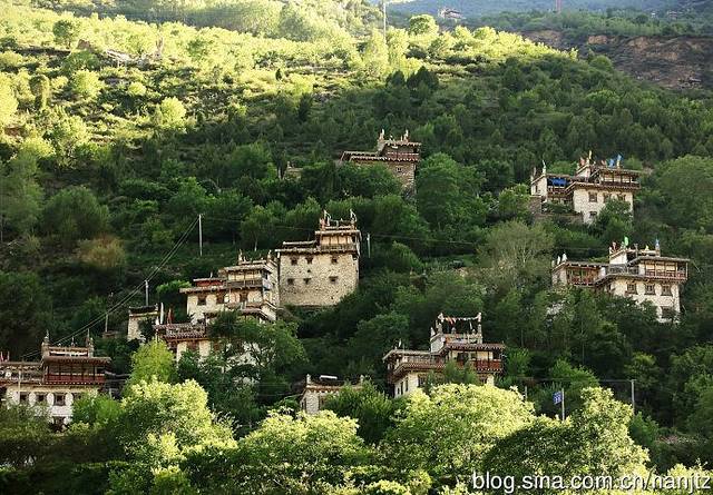 甲居藏寨位于四川甘孜州丹巴县境内,从县城驱车向北,大金河谷上游,一条蜿蜒爬坡的山路约10公里,便见从河谷的西侧层层向上,一幢幢藏式楼房洒落在绿树丛中,或星罗棋布,或稠密集中,或在高山悬崖上,或在河坝绿茵间,与充满灵气的山谷、清澈的溪流一起一直伸延到卡帕玛群峰脚下,展现出一幅田园牧歌式的画卷。