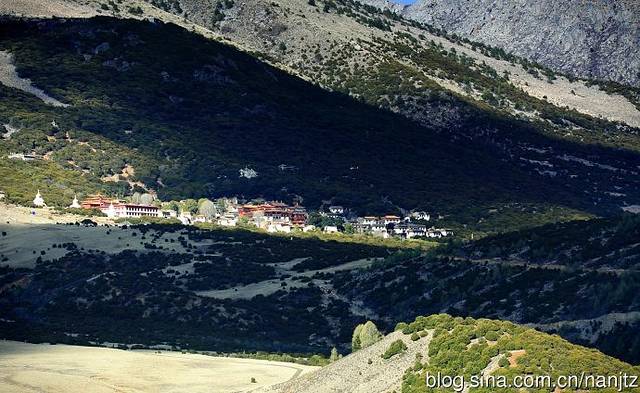 在318国道旁远眺海子山下的冷谷寺,清幽而神秘。