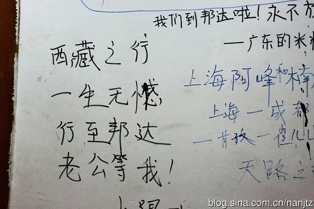 邦达客栈走道和房间的墙上写满了骑行者的心情,成了青年旅社的一大特色。(夜深拍摄,iso很高,歉)