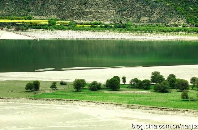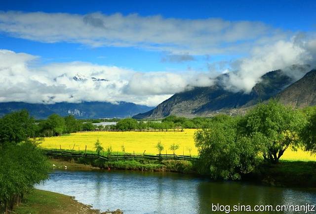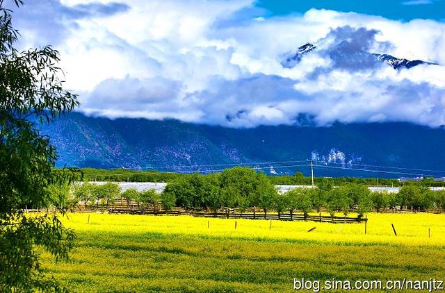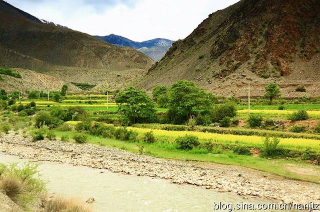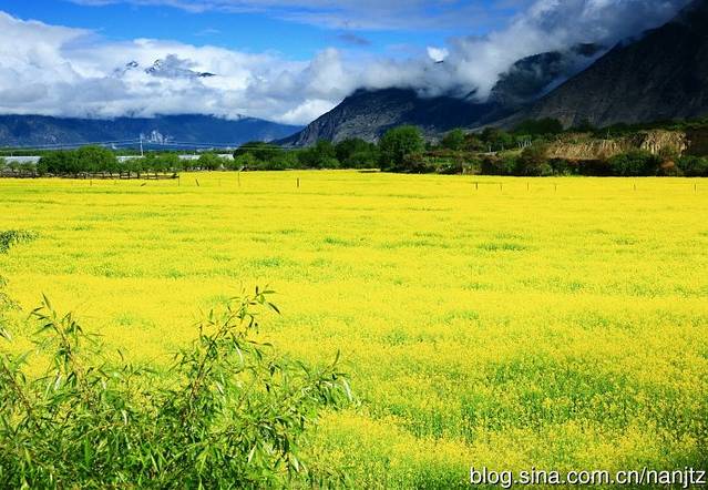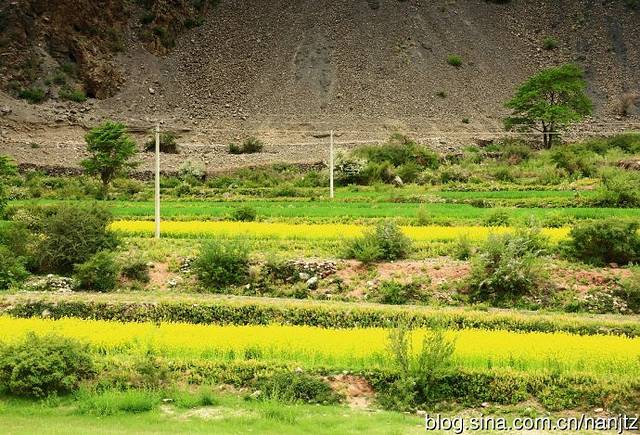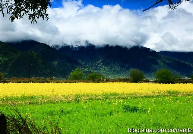 由于海拔高气候寒冷,高原的春天总是要来得晚一些,在烟雨的江南每年三月油菜花就开了,而在青藏高原的川西、藏东地区,要憋到五月份才陆续怒放。在天高气清的山坡河谷,金黄的油菜花印在青山绿水间,油彩一样的鲜艳。