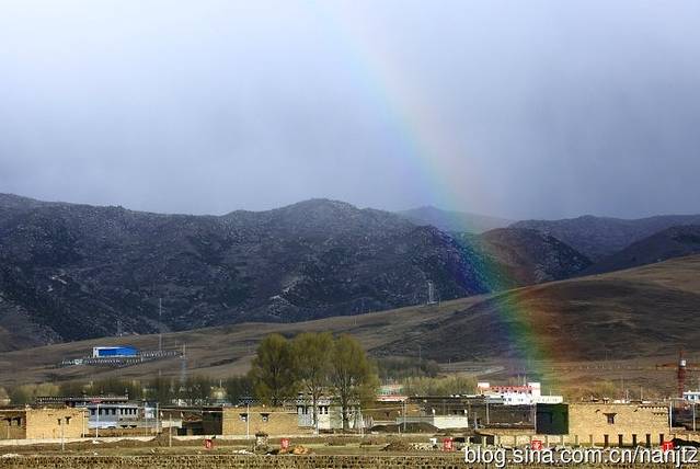 在稻城县城外围“傍河”边的加油站加油时,一阵小雨过后,突现彩虹横跨两岸,匆忙中举起相机。海拔约3700米。
