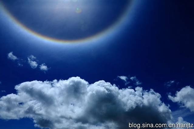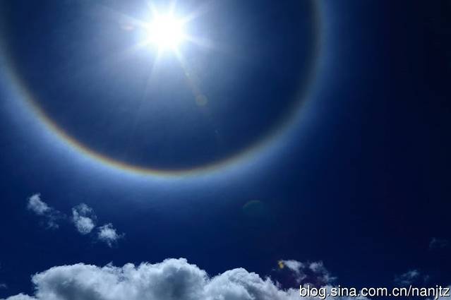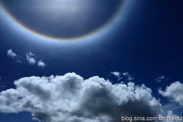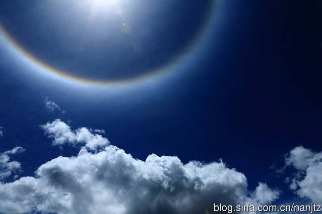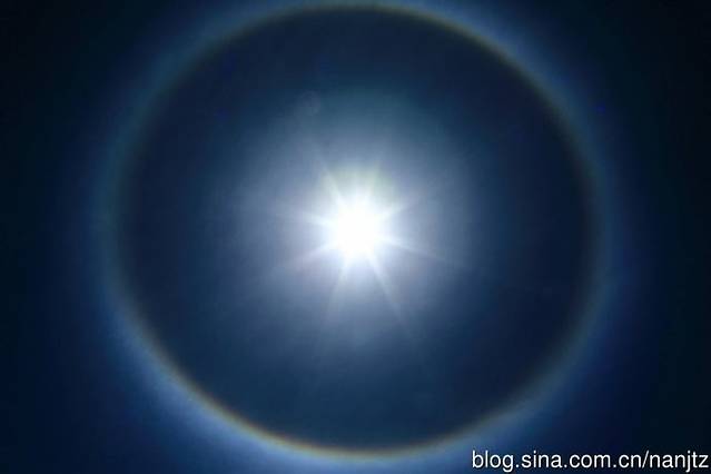 来查了百度,说:日晕是一种大气光学现象,是日光通过卷层云时,受到冰晶的折射或反射而形成的。当光线射入卷层云中的冰晶后,经过两次折射,分散成不同方向的各色光,看上去在太阳的周围出现一个圆圈,由内而外呈红橙黄绿青蓝紫七种颜色。有意思吧?