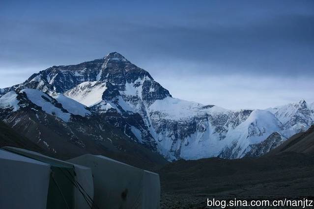 早上7点,万籁寂静,帐篷后珠峰的积雪首先透出光亮。