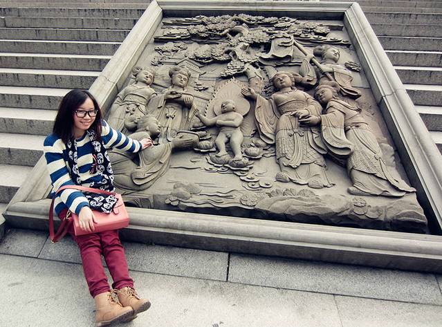 在景区门口坐车上山,大概20分钟,到了停车场,下了车还要走一段长石梯才能到南海观音山检票处。