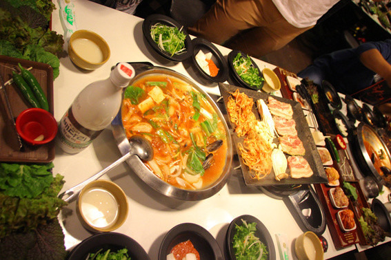 从青旅出来我们就直接找地铁去新村觅食了。这里要说明一下,韩国的地铁并不便宜,而且台阶又长又多,爬起来很累,所以如果同行人比较多的话(四个人最合适)打车是最好的选择。所以之后的三天我们天天打车……韩国的出租车有三种:按颜色分黄色、银色和黑色。黑色是international的出租车,司机会说英语和中文什么的,所以比较贵,轻易不要乘坐。其余两种起步价和北京差不多。只要你把地址给司机,他也可以把你带到目的地。这里要称赞下首尔的出租车:干净、宽敞、服务态度好。而且多数配导航,推荐~
