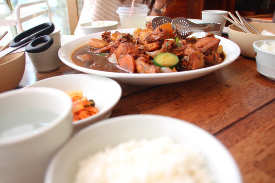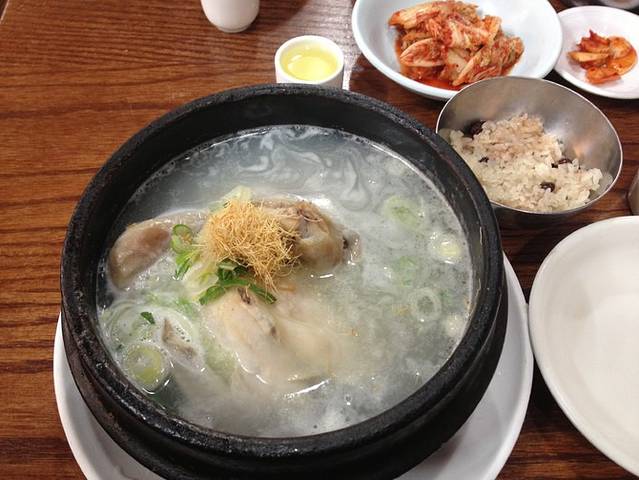 最后,在明洞吃到我们这一行最贵也最不好吃到一餐——参鸡汤。其实就是泡在汤里,肚子里填满糯米和大枣人参什么的的童子鸡,味道非常淡,要蘸着调料吃。这个饭量太大,两个女生吃一份合适……