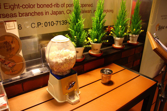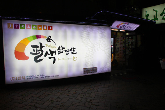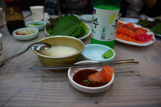 这顿烤肉大餐要好好说道一下。这家餐厅是韩国本地人推荐的,也有很多名人明星来吃过。所谓八色烤肉就是八种口味的烤肉,就是下图右侧木头台面上那八小碟。它们是按味道由轻到重依次是人参味、原味、红酒味、松叶味、香草味、咖喱味、大酱味以及韩式辣酱味,烤肉的时候要按照由轻到重的口味来吃,。每一种口味都很赞。值得一提的是那一大份海鲜汤还有泡菜、蔬菜沙拉以及包肉吃的几种菜叶都是赠品呢。吃的时候有个中国女生帮我们烤,所以也交流无障碍啦。
