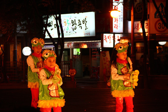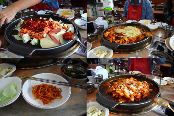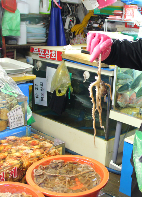 重口味的食物:据说只有韩国人才会吃的章鱼刺身。吃法很简单,就是把这个活生生的章鱼洗洗,切碎,沾香油吃……我和一个小伙伴鼓起勇气尝试了下,另外两个小伙伴各种目不忍视……就口味来说基本可以总结为木有味道啊……不如芥末章鱼,烤章鱼和章鱼小丸子好吃。不过这个体验很特殊:章鱼即使切碎了,神经也还在,所以在整个品尝到过程中,它的触须们都在各种扭动,放到香油里就扭动到更厉害了。于是我脱口而出:它们会自己蘸料~另外两个小伙伴呈呕吐状奔走……不过吃起来还是快点咀嚼咽下去到好,不然它们的吸盘会吸附在你到舌头上呢。
