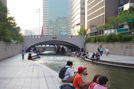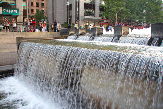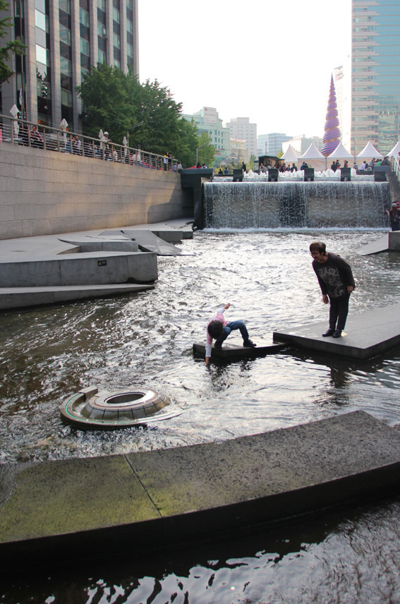 补充好能量我们就向清溪川进发了。想来这里绝对是受职业病的驱使。上学的时候听过一个韩国教授的讲座,他就重点提过这个景观项目,当时就很是心驰神往,没想到就这样阴差阳错的达成所愿了。